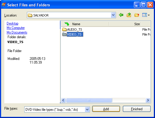 Sélectionnez le dossier VIDEO_TS obtenu grâce à Magic DVD Ripper (par exemple, dans la capture de l'étape1, il s'agit de"G:\movies\SALVADOR\VIDEO_TS\") et cliquez sur "Add". Puis cliquez sur "Finished" pour fermer cette fenêtre.