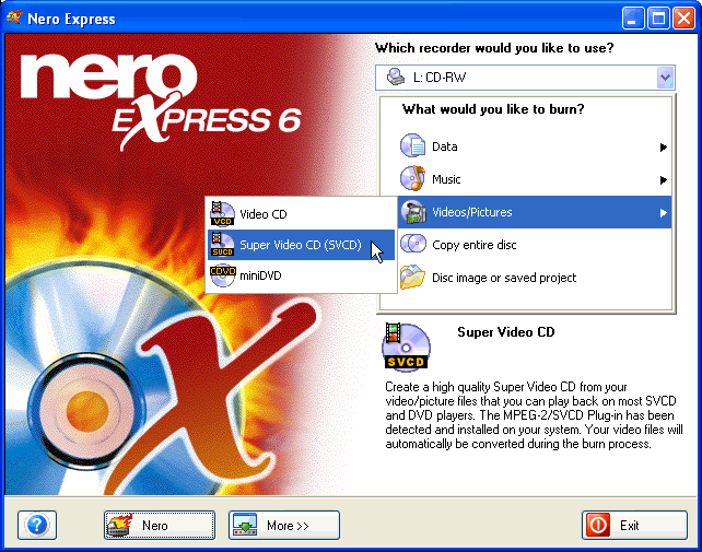 Lancer Nero Express. Sélectionnez votre graveur CD-R/RW dans le menu déroulant "Which recorder would you like to use?". Puis sélectionnez Videos/Pictures > Super Video CD.